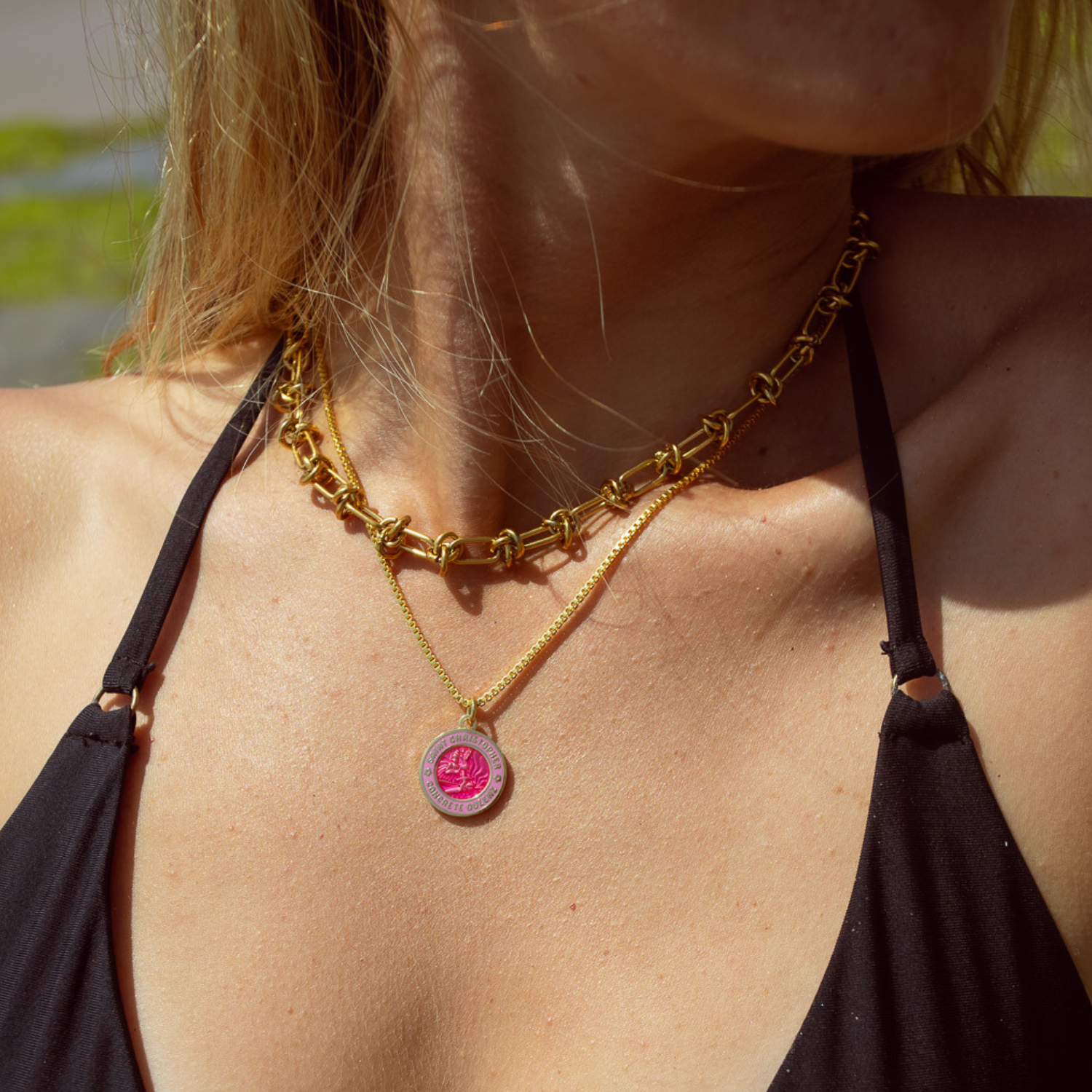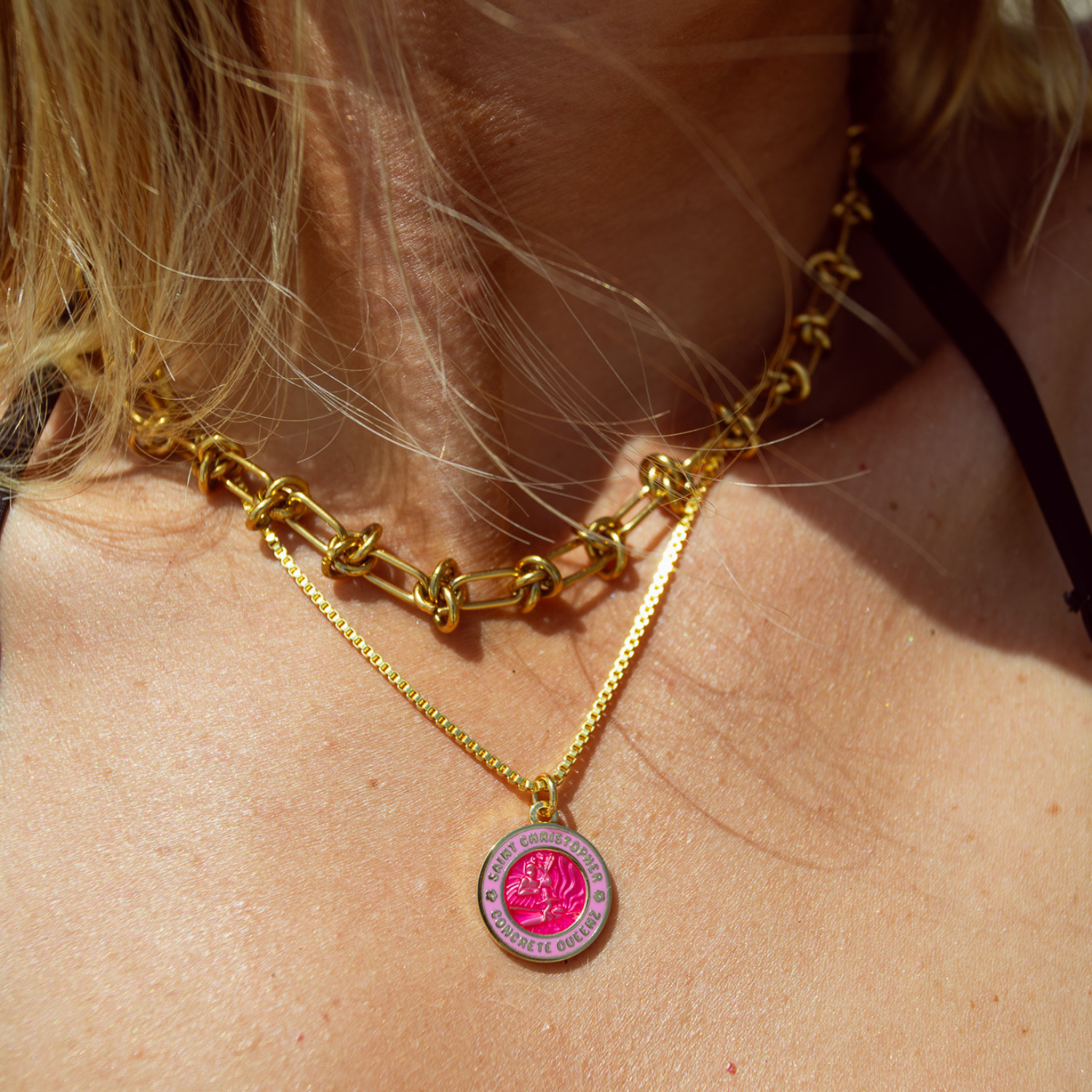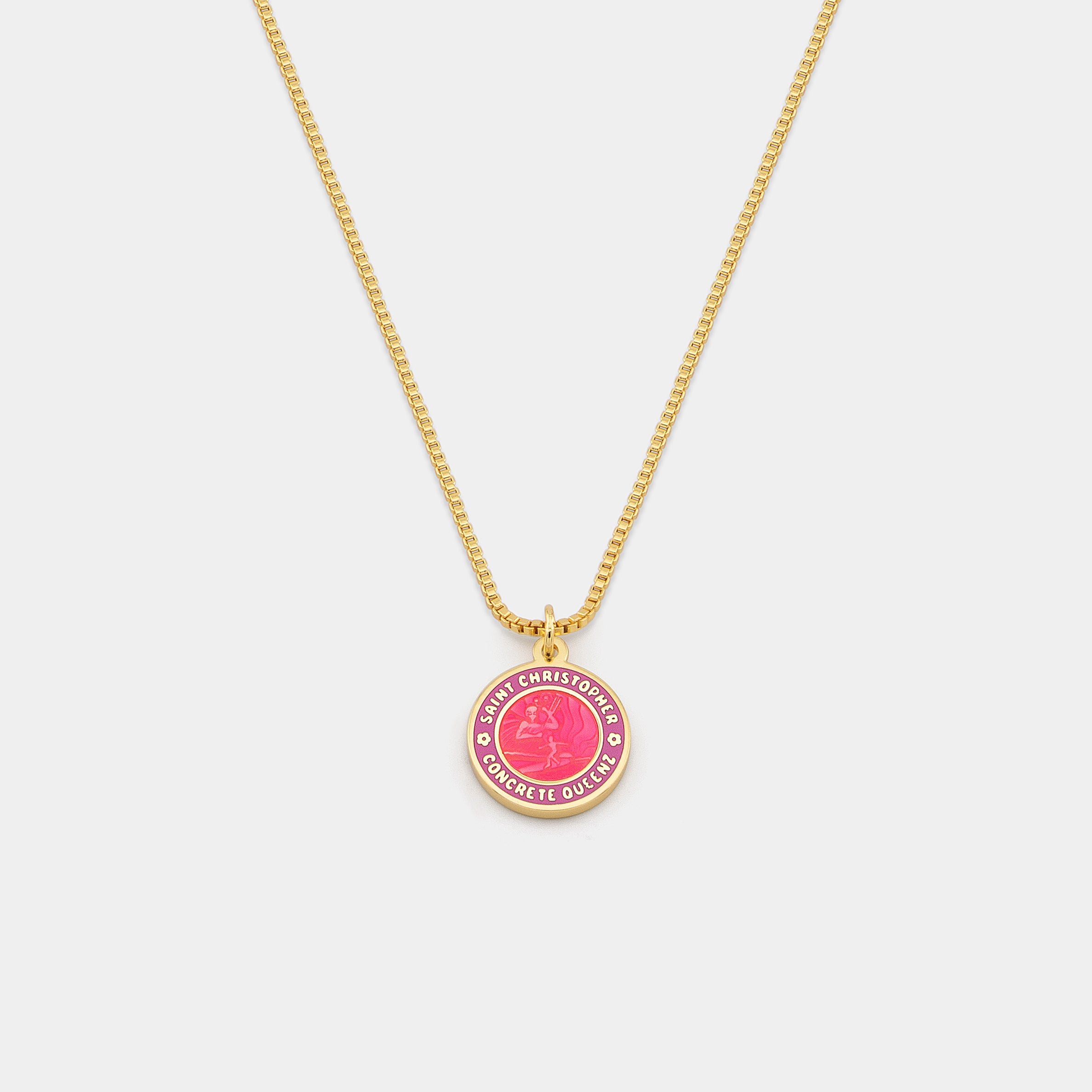 Eine St.-Christophorus-Halskette, die in Zusammenarbeit mit Gründerin Audrey von Concrete Queenz entstanden ist – einer Community für Mädchen, die in Los Angeles skaten! Concrete Queenz ist eine gemeinnützige Organisation, die benachteiligten Mädchen in South LA Skateboarding und Gemeinschaft bietet. Ihre Mission ist es, einen sicheren und inklusiven Raum zu schaffen, in dem Mädchen Skateboarding lernen und üben und gleichzeitig wichtige Lebenskompetenzen wie Führungsqualitäten, Teamfähigkeit und Kommunikationsfähigkeit entwickeln können. - 3/4" limitierte, vergoldete St.-Christophorus-Medaille mit rosa Emaille, 19 mm (3/4") - 40,6 cm (16") lange, abgerundete Boxkette mit 5 cm (2") Verlängerungskette - Edelstahl mit langlebiger 14-Karat-Vergoldung (1 Mikron)