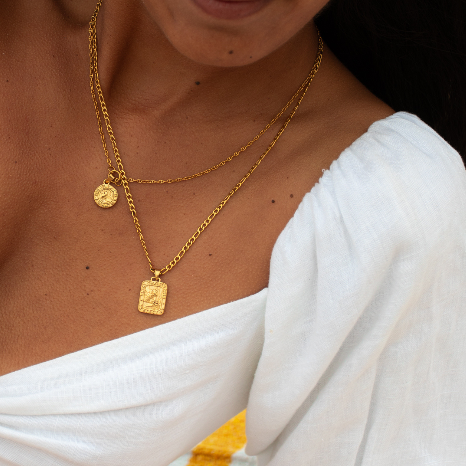 Wir präsentieren unsere Gold Traveler Rechteck-Halskette – der ultimative Begleiter für alle, die sonnenverwöhnte Küsten und salzige Brisen lieben! Diese Halskette besticht durch einen eleganten, rechteckigen Anhänger, der den Abenteuergeist verkörpert. Die 48 cm lange, flache Figaro-Kette ist mit einem Karabinerverschluss versehen. - 18 Karat vergoldeter Edelstahl
