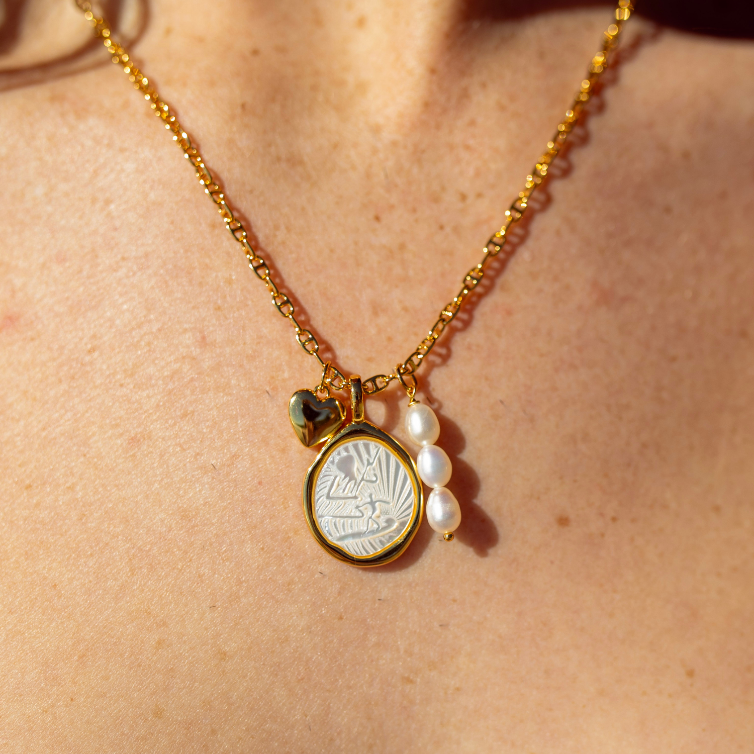 Fangen Sie den perfekten Glanz mit unserer neuen Golden Hour Halskette ein. Sie ist Teil unserer Valentinstagskollektion und besticht durch einen exklusiven Perlmuttanhänger in Goldfassung, einen individuellen Herzanhänger und eine Perlenkette, die an Sonnenschein auf den Wellen erinnert. Voller Strand-Charme ist sie wie geschaffen für all die Menschen, die Ihr Leben ein bisschen heller machen.