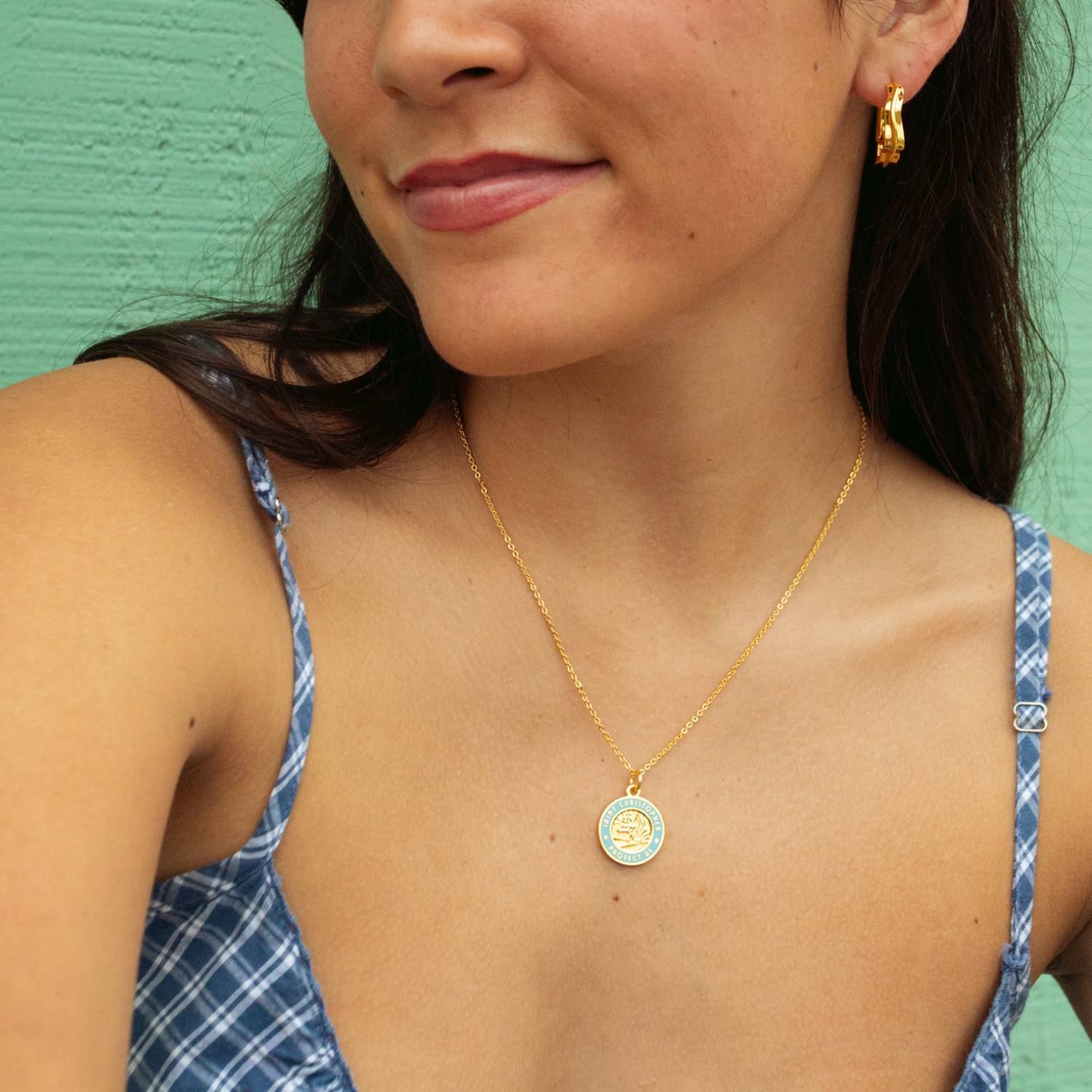 Sie haben gefragt, wir haben zugehört! Wir präsentieren unsere neue goldene St.-Christophorus-Halskette in Babyblau. Mit ihrem wunderschönen babyblauen Emaille-Rand ist diese Halskette die neueste Ergänzung unserer klassischen Kollektion. Jetzt in noch mehr Farben erhältlich, sind unsere goldenen St.-Christophorus-Halsketten perfekt für jeden Anlass. Nur solange der Vorrat reicht!