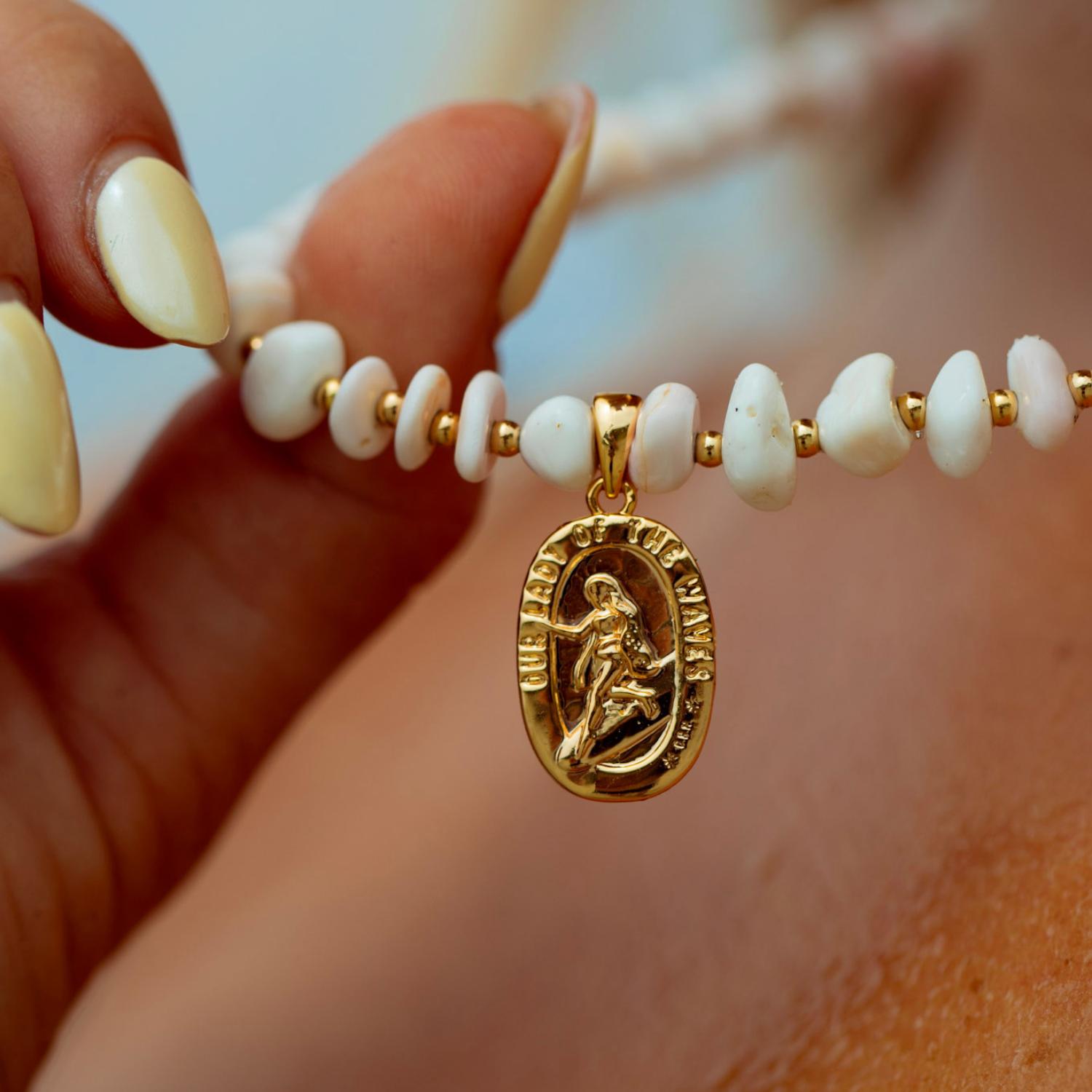Sie liebten unsere ikonische „Unsere Liebe Frau der Wellen“ so, dass wir sie in eine wunderschöne Perlenkette verwandeln mussten. Die Perlenkette „Unsere Liebe Frau der Wellen“ verleiht unserem beliebten Design eine neue Note – mit der strahlenden Jungfrau von Guadalupe, die auf den Wellen reitet, kombiniert mit Muschelperlen. Sie ist die perfekte Mischung aus Vintage-Charme und lässiger Küstenatmosphäre und eignet sich ideal zum Kombinieren mit anderen Ketten, für sonnige Tage und um gute Laune zu tanken.