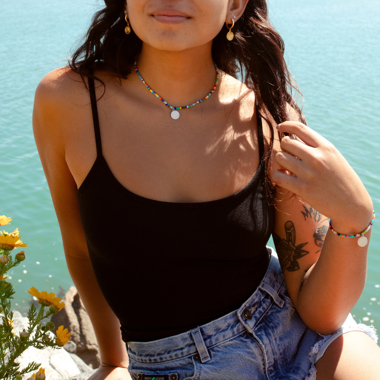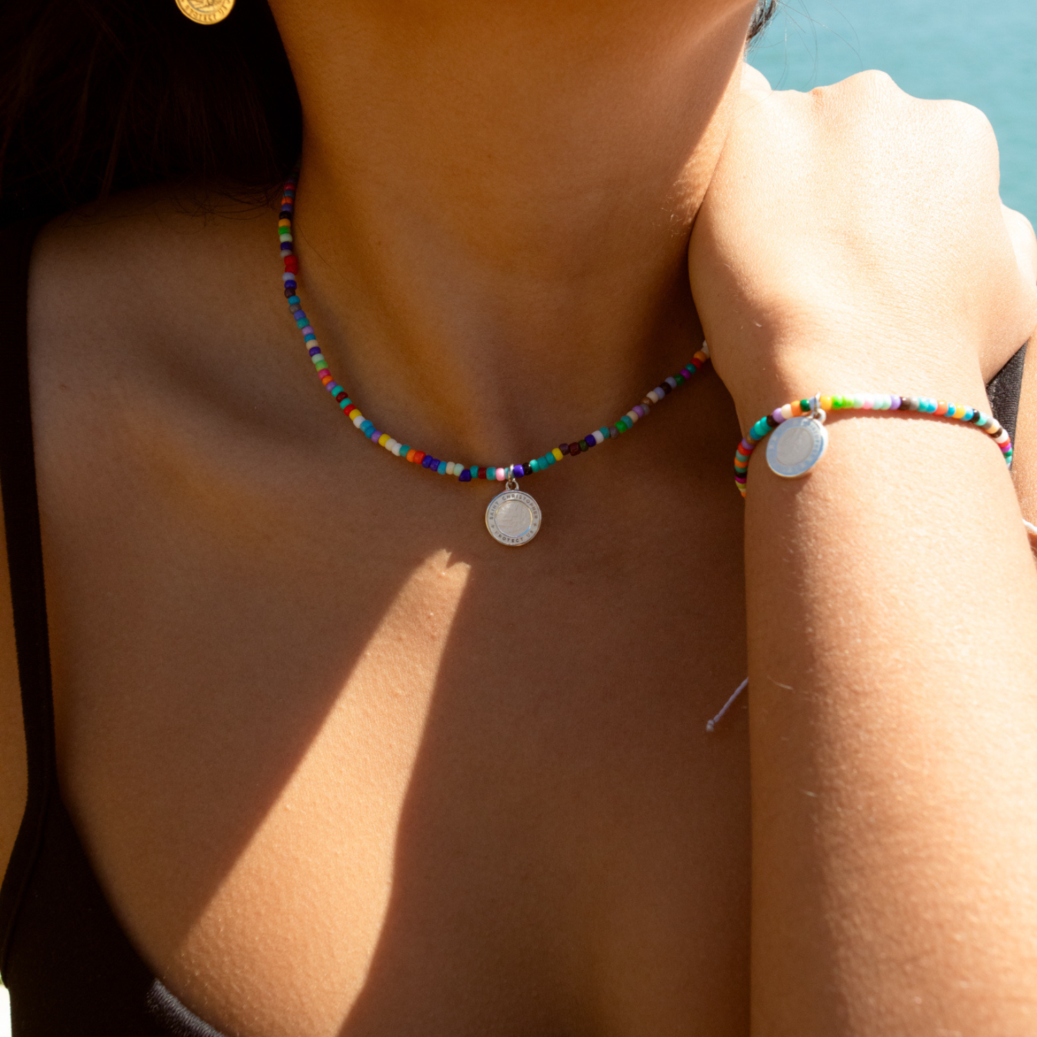 Wir haben eure Wünsche gehört und präsentieren euch unser beliebtes Regenbogen-Perlenchoker mit dem ikonischen St.-Christophorus-Anhänger. Mit Karabinerverschluss und Verlängerungskette ist dieses farbenfrohe Accessoire bereit, euren Stil wieder zum Strahlen zu bringen. Lasst euch dieses Lieblingsstück nicht entgehen!