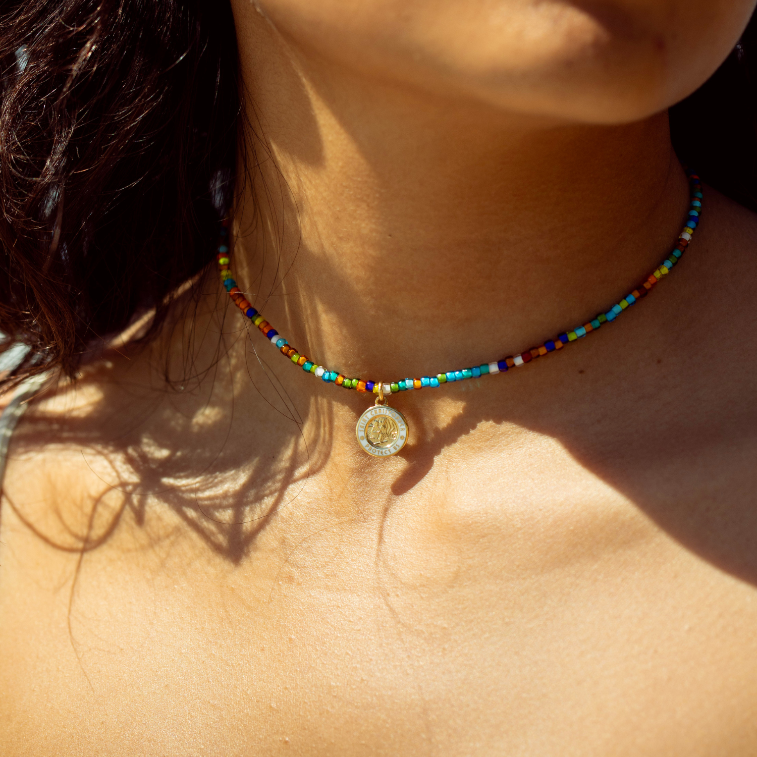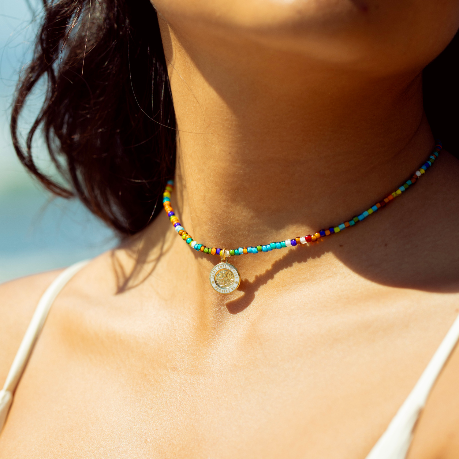 Verleihe deinem Abenteuer mit dem Retro-Regenbogen-Perlenchoker einen Farbtupfer! Dieser Choker mit einer lebendigen Mischung aus bunten Rocailles und einem kleinen gold-weißen St.-Christophorus-Anhänger ist die perfekte Kombination aus Vintage-Surf-Style und Glücksbringer. Trage ihn solo oder kombiniere ihn mit anderen Ketten für den ultimativen Beach-Look!