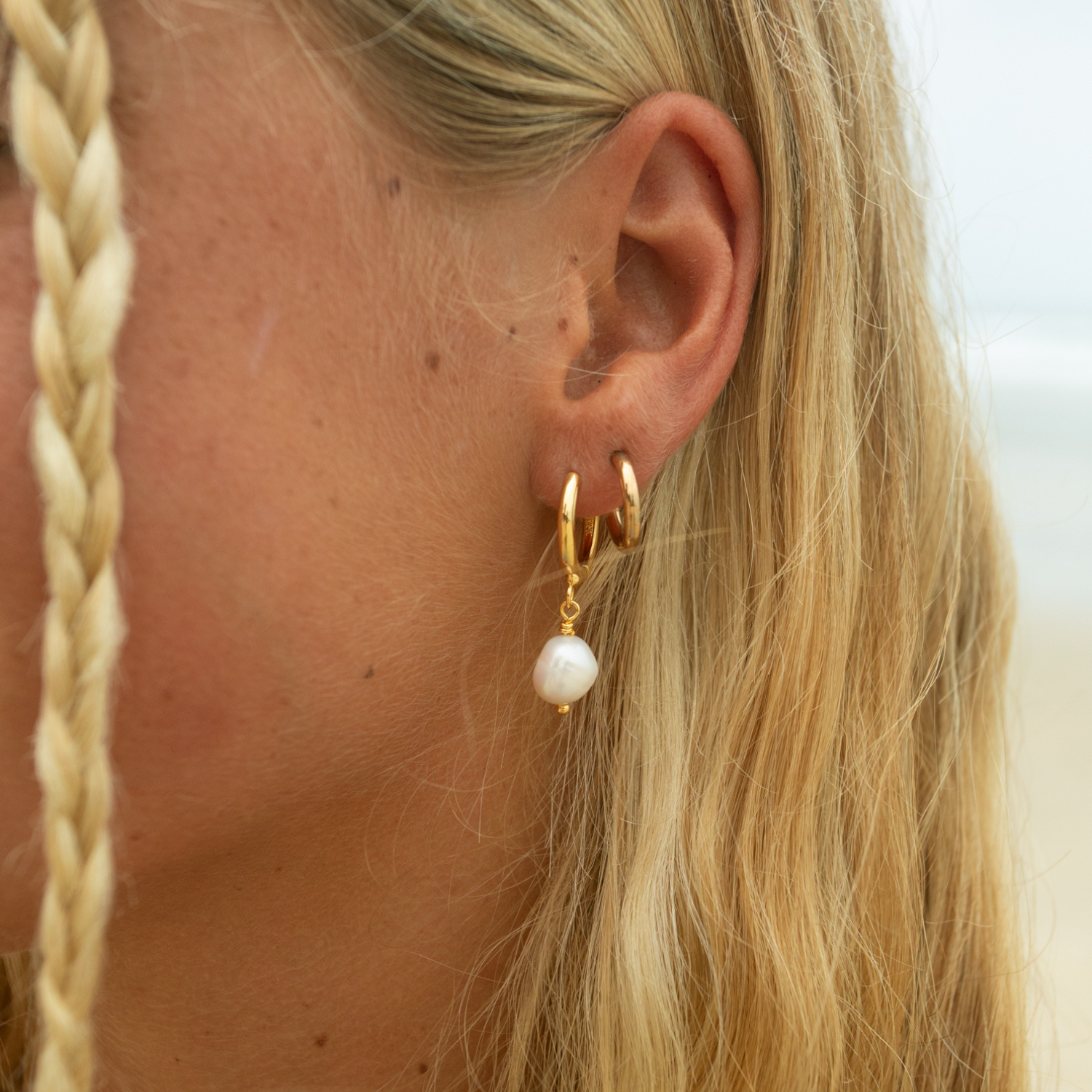 Wir präsentieren die Shoreline Pearl Hoop Ohrringe! Diese traumhaften Ohrringe im Strand-Look bestechen durch strahlende Süßwasserzuchtperlen, die jedem Outfit einen Hauch von maritimer Eleganz verleihen. Perfekt für jeden Strandtag oder jedes Küstenabenteuer!