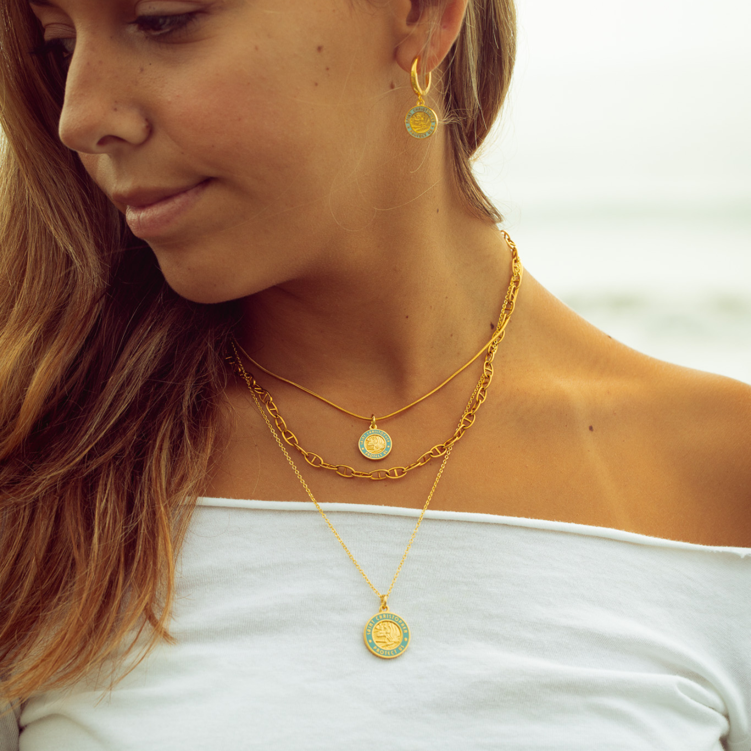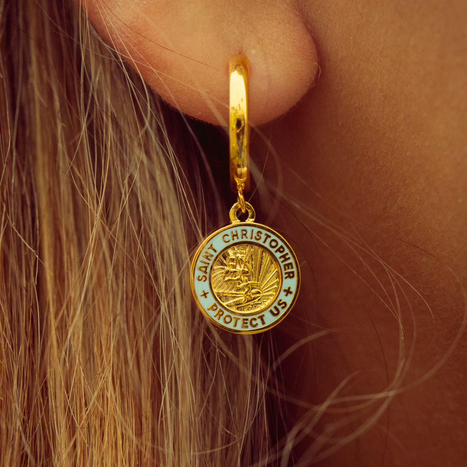 Reisen Sie stilvoll mit unseren neuen goldenen Babyblauen St.-Christophorus-Ohrringen. Der Schutzpatron der Reisenden ist in elegantem Babyblau emailliert und von einem glänzenden Goldrahmen umgeben. Diese Ohrringe sind perfekt für alle, die sich Schutz und einen Farbtupfer für ihren Alltag wünschen.