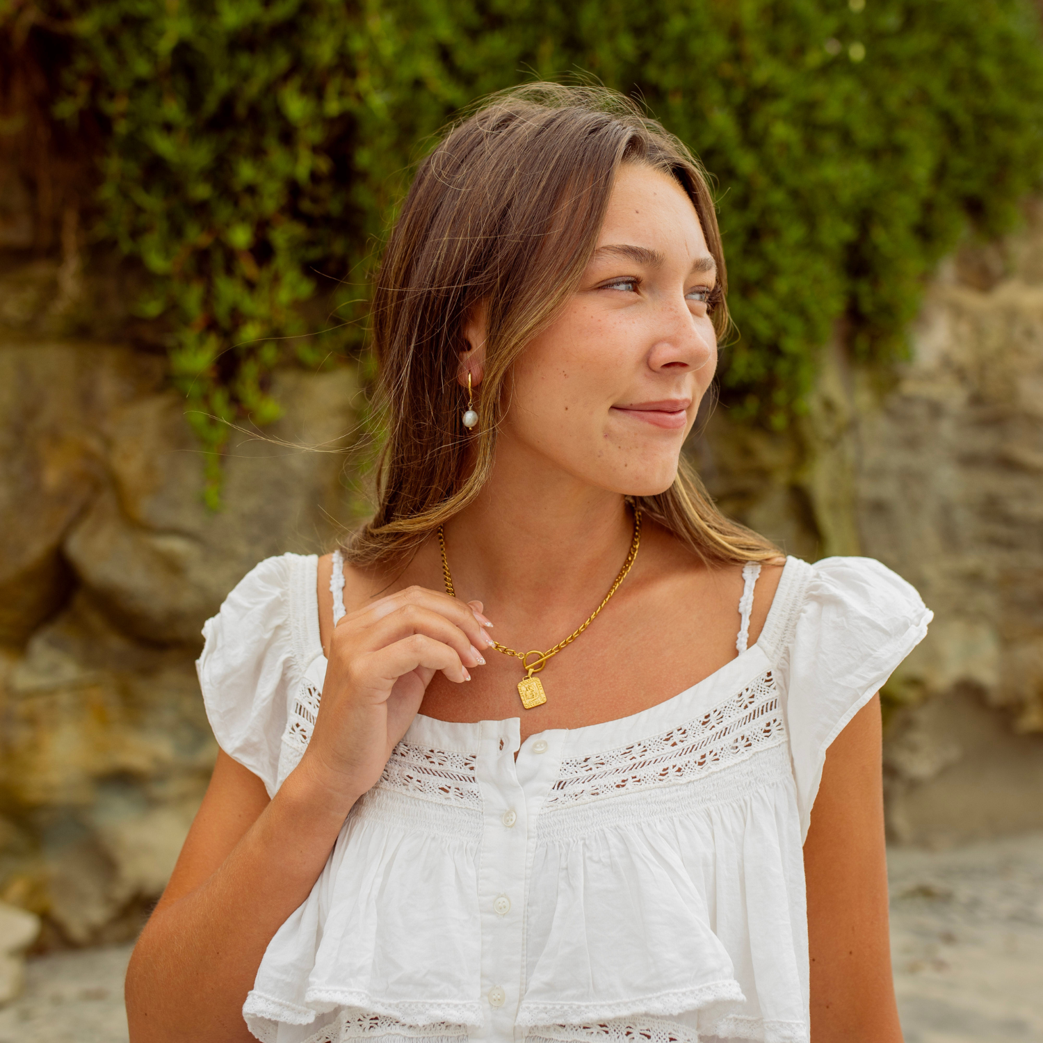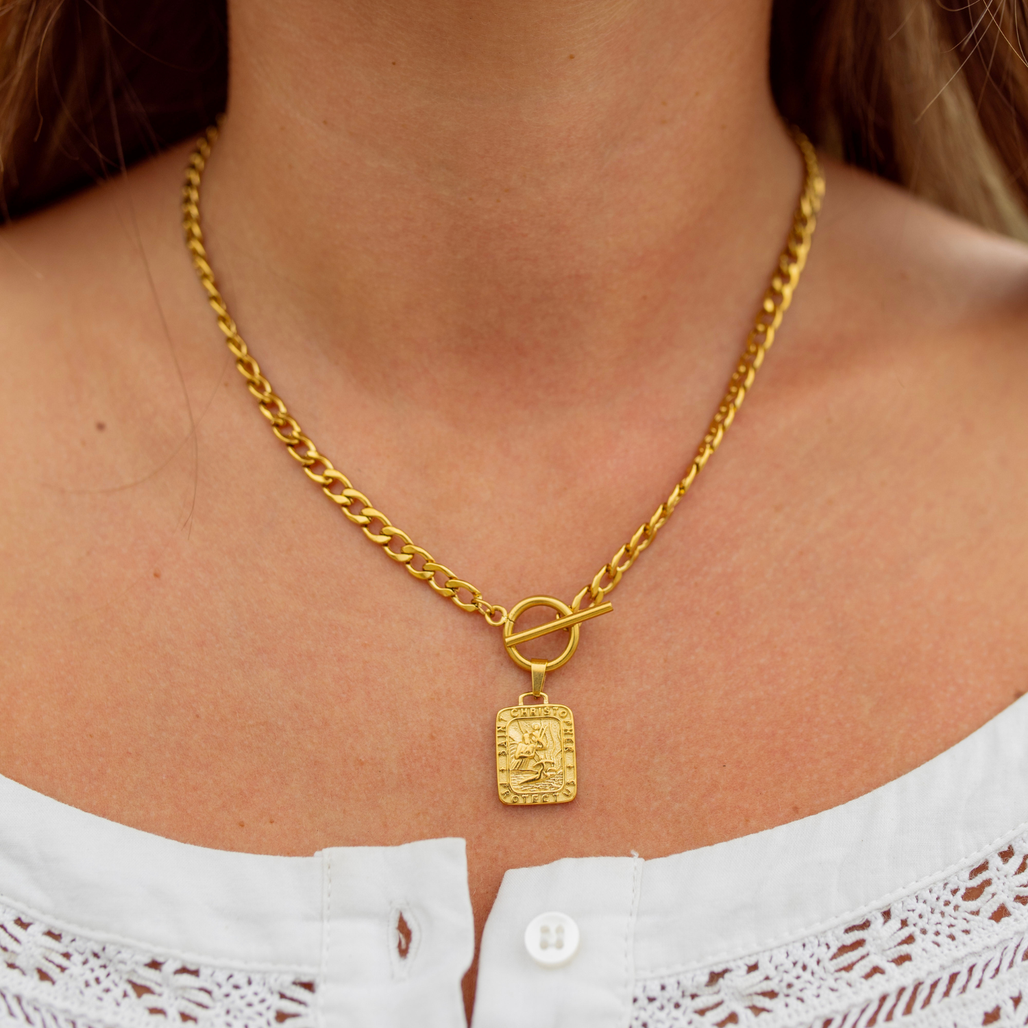 Lernen Sie die Sunset Cliffs Halskette kennen – inspiriert vom Zauber der goldenen Stunde an der Küste. Dieses strahlende Schmuckstück fängt den nostalgischen Glanz eines Sonnenuntergangs am Strand ein. Zeitlos, golden und mit mühelosem Küstenflair – die neueste Art, ein Stück Sonnenschein überallhin mitzunehmen. - Edelstahl mit 18-karätiger Vergoldung - Gesamtlänge der Halskette: 45,7 cm (38,1 cm Kette, 2,5 cm Verschluss, 5,1 cm Verlängerungskette) - 5 mm flache, glatte Panzerkette - Knebelverschluss
